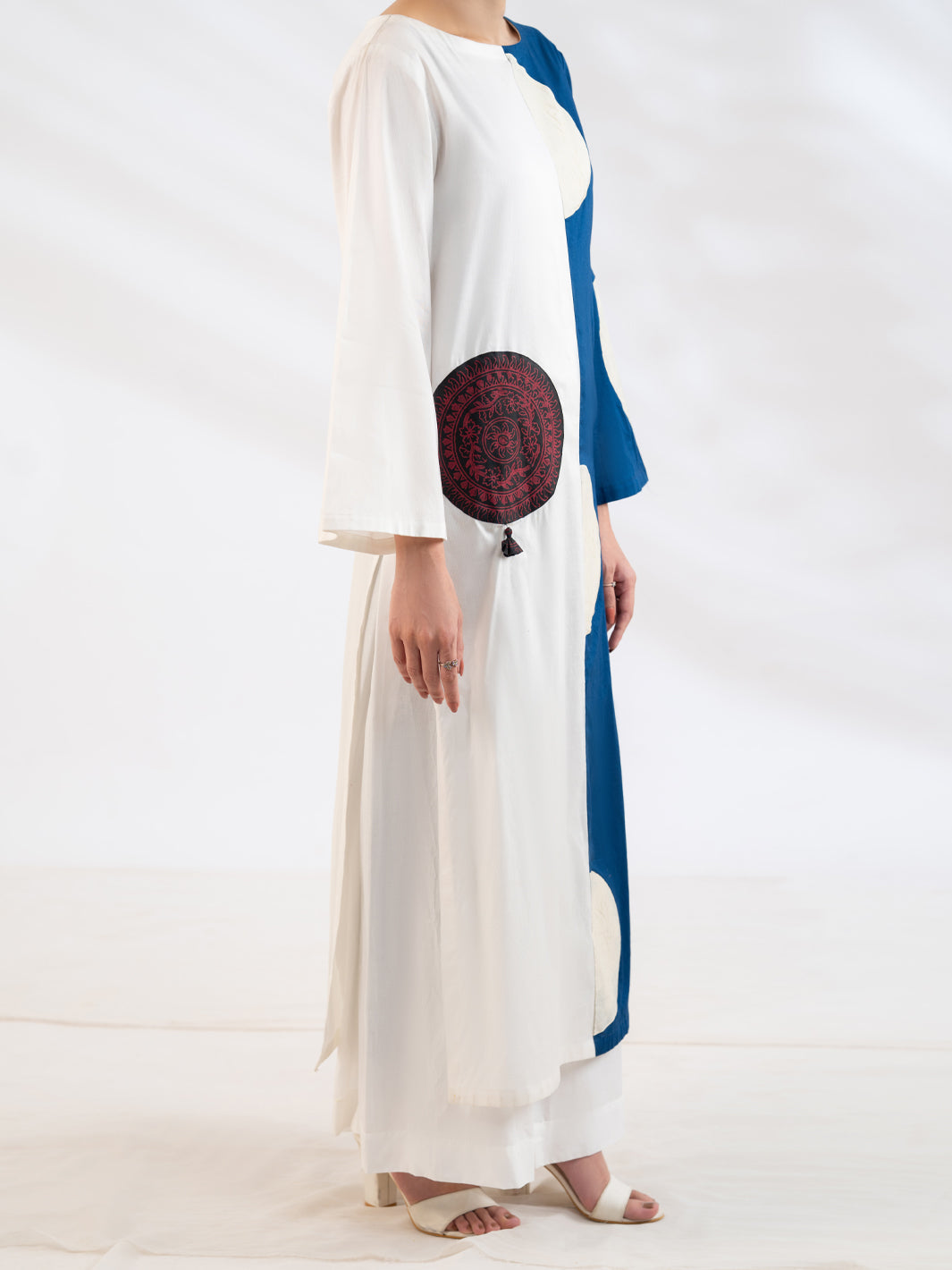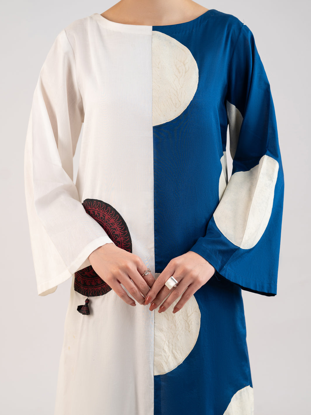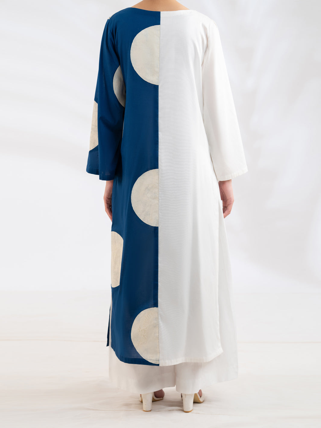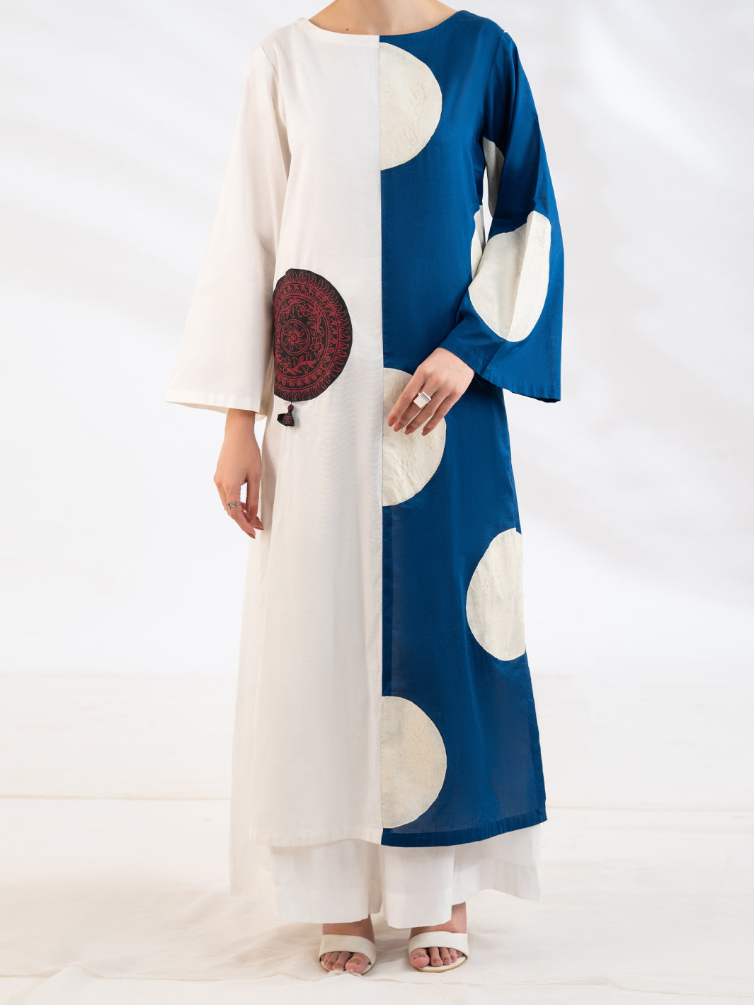 Dyed lawn block printed straight long length shirt detailed with applique work