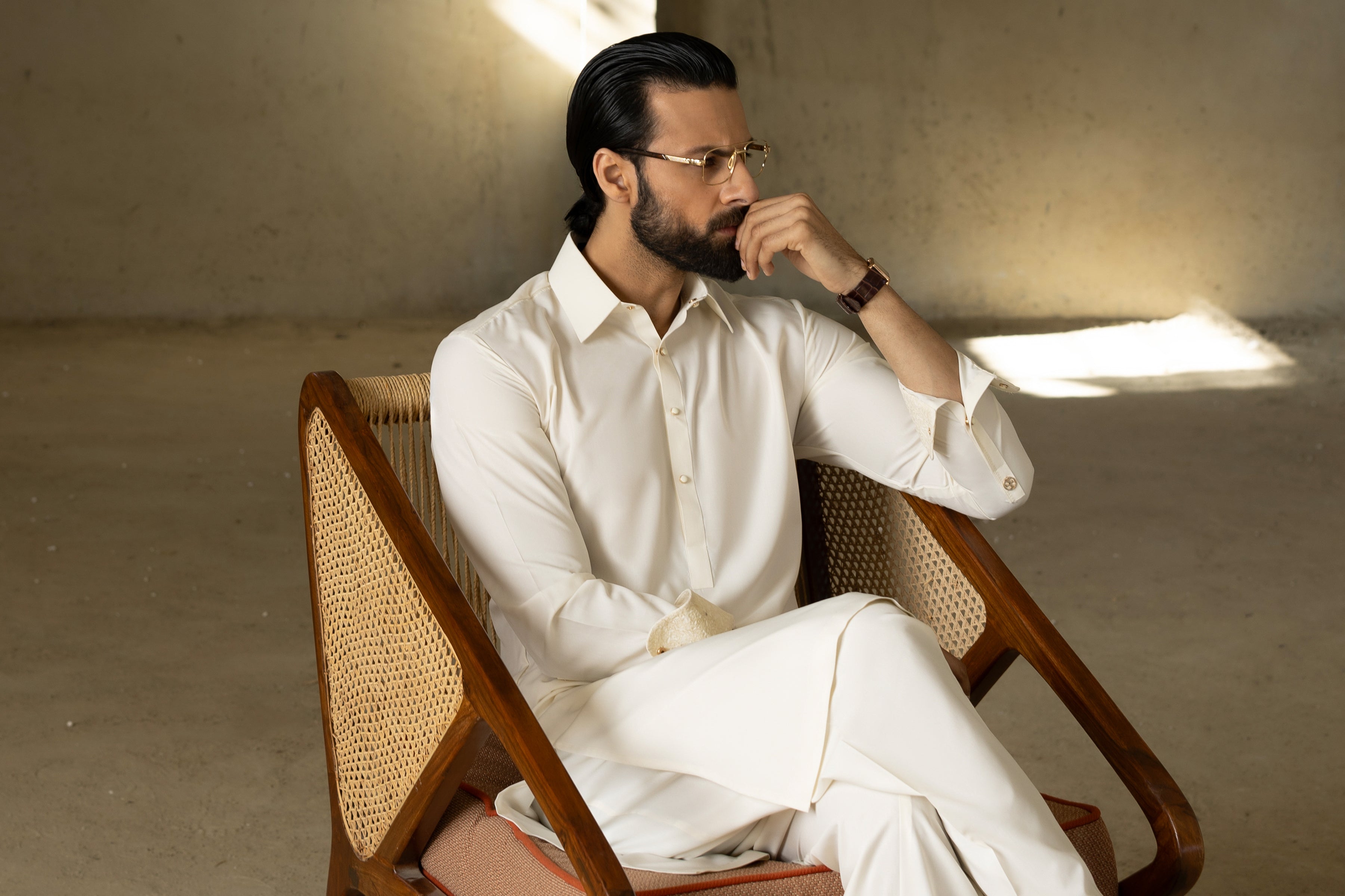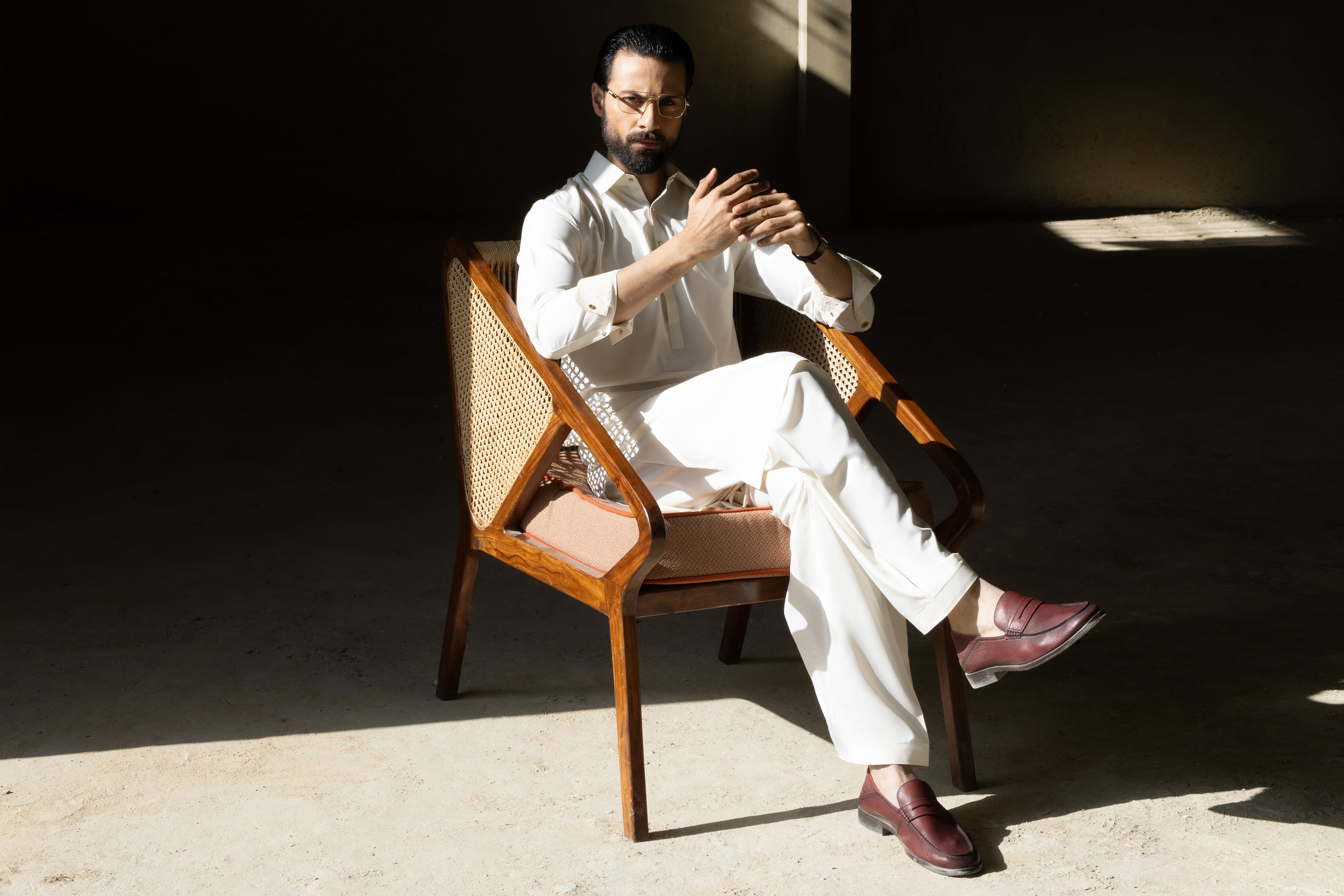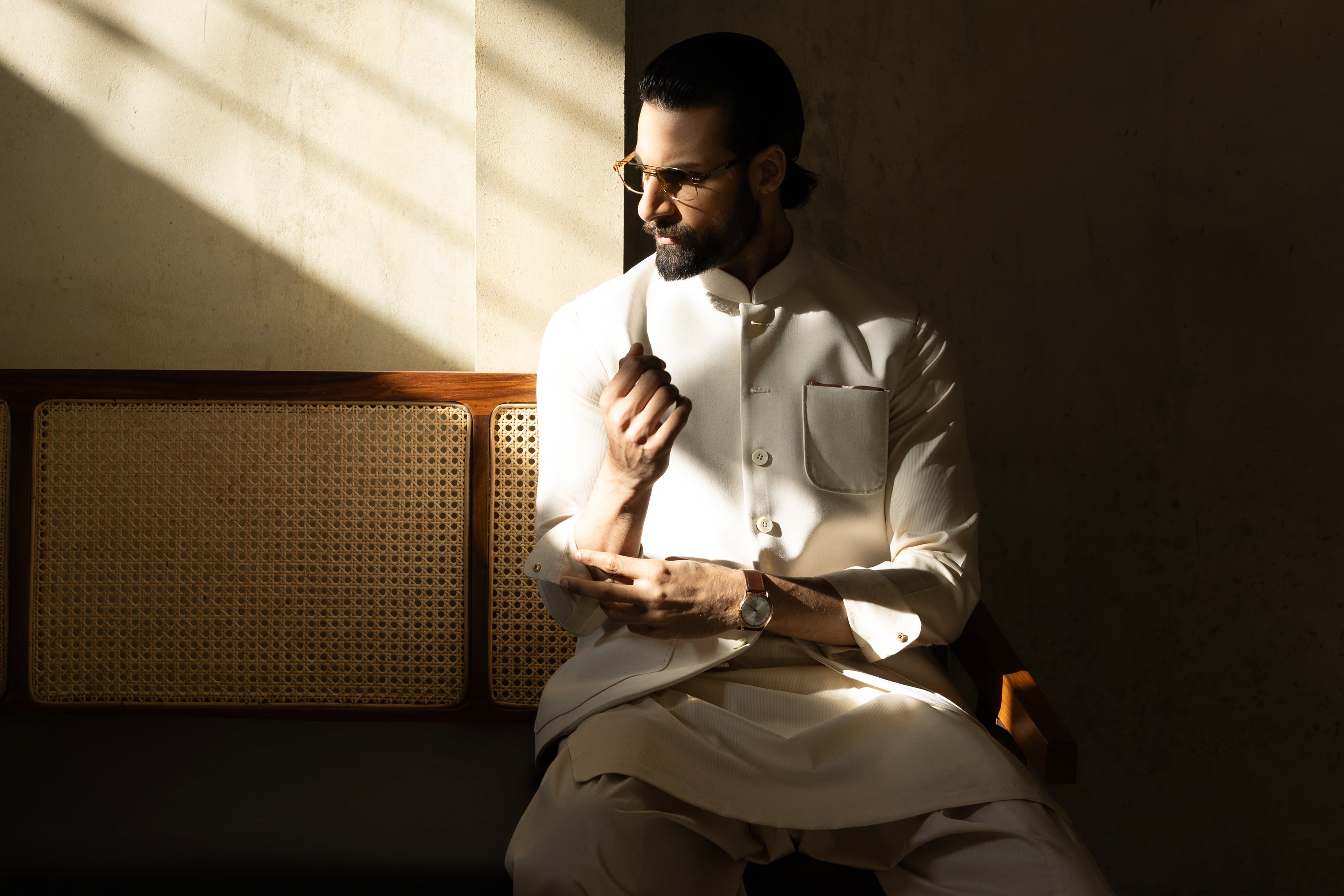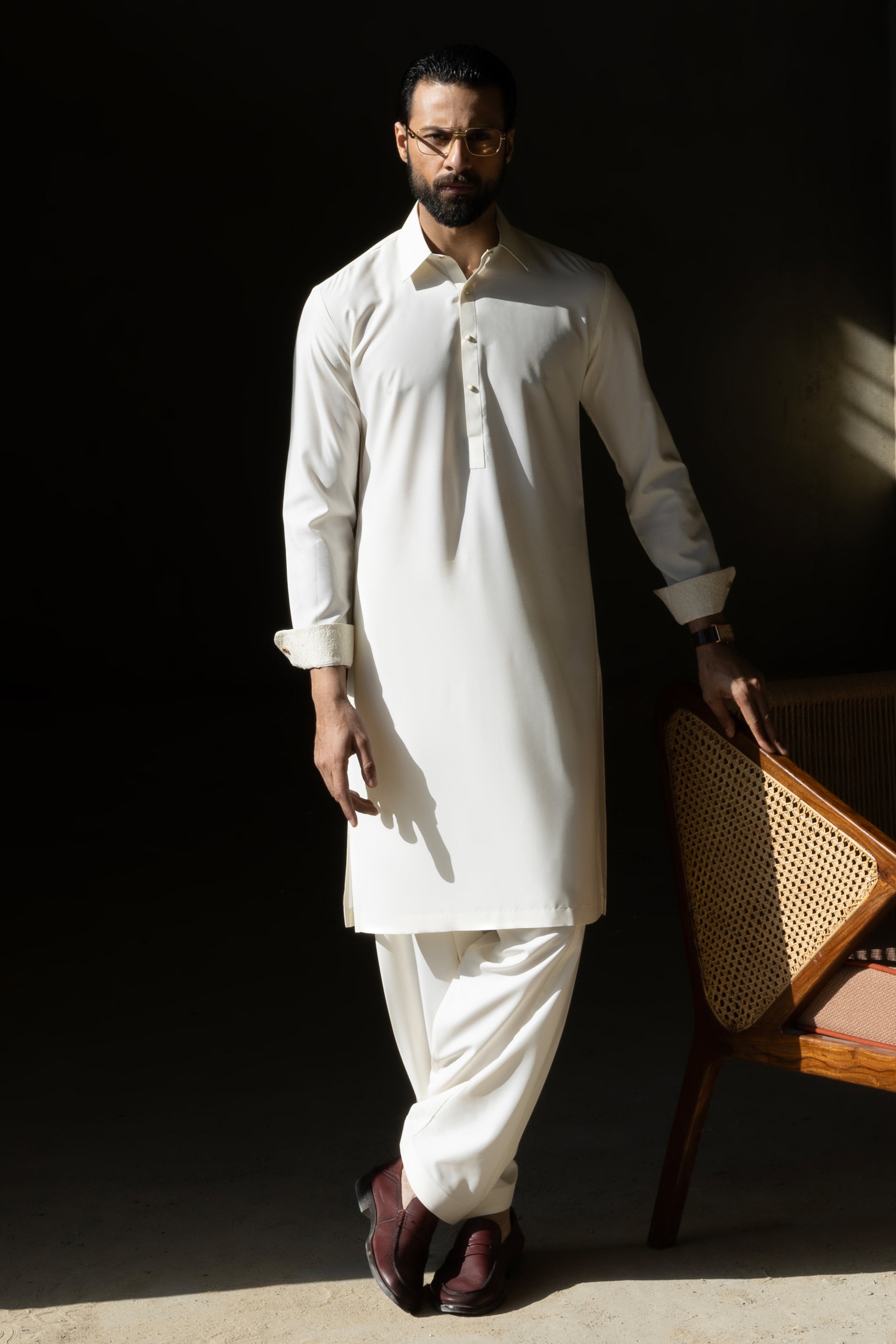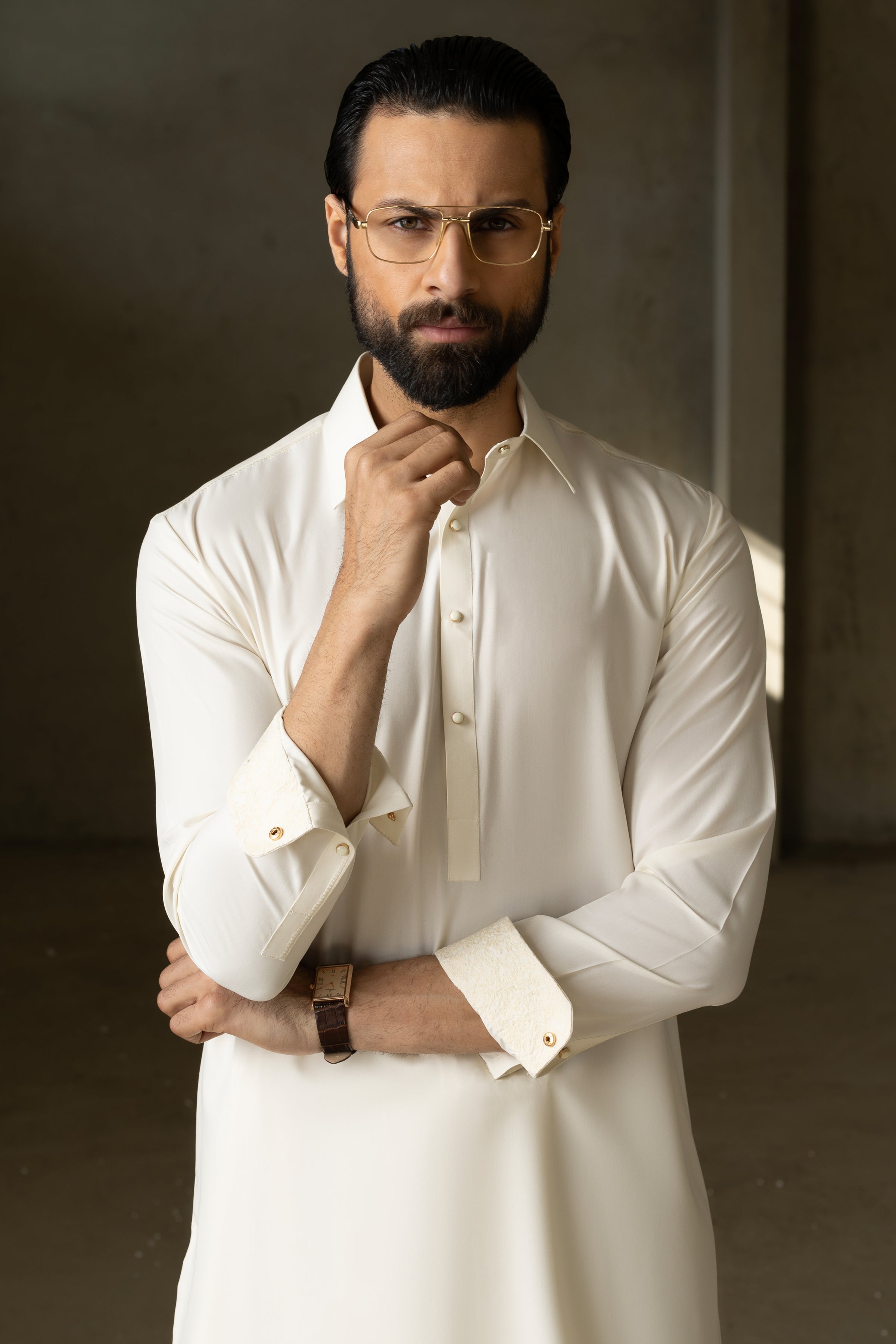 Shirt Collar With Cuffs, Embroidery at Yoke , Front Shoulder, Vent & Cuffs Square Hem. Embroidery Pattern Detail Inside Yoke and Inside Cuffs.
