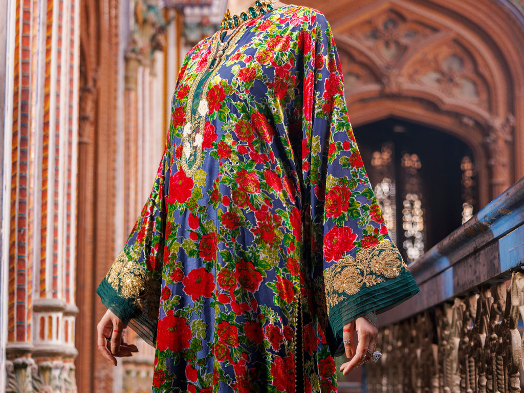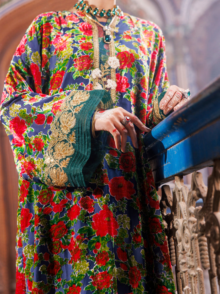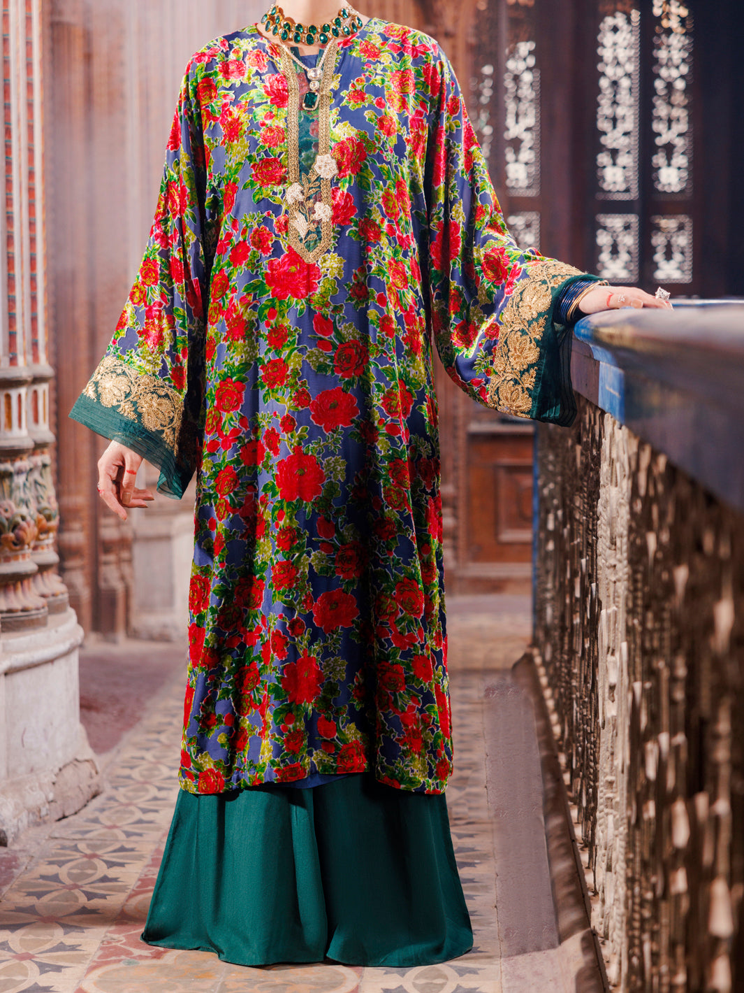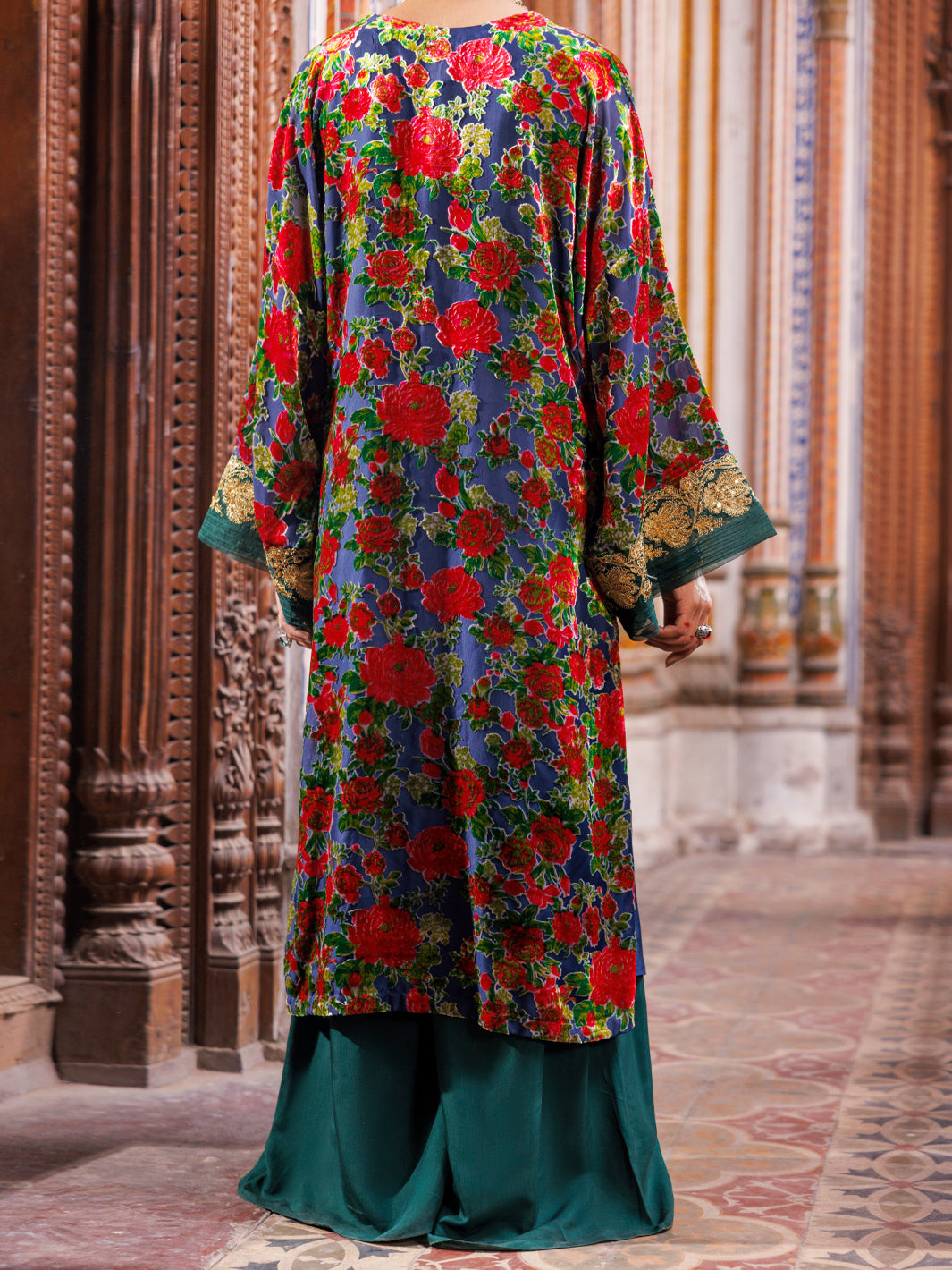 Long Length Palachi (Velvet Burnout) Shirt With Embroidered Neckline And Sleeves Borders With Organza Details Paired With Maple Silk Loose Ijaar.