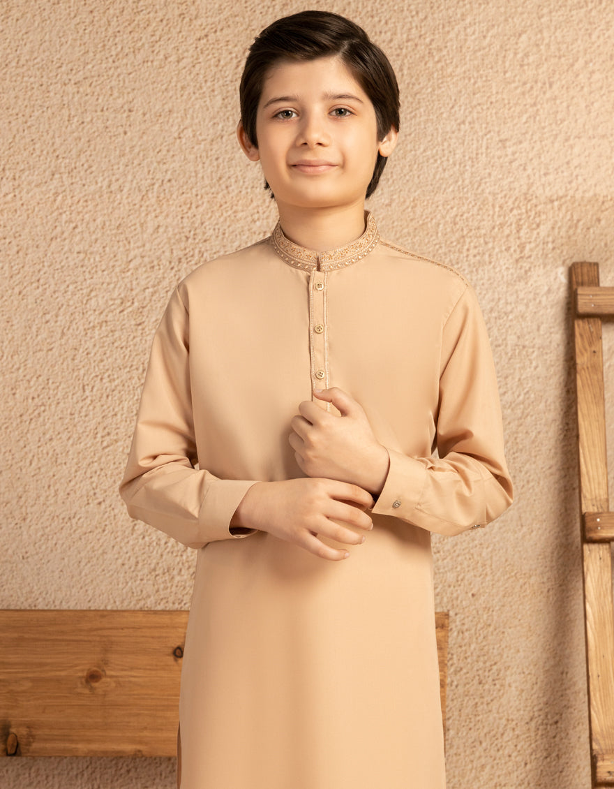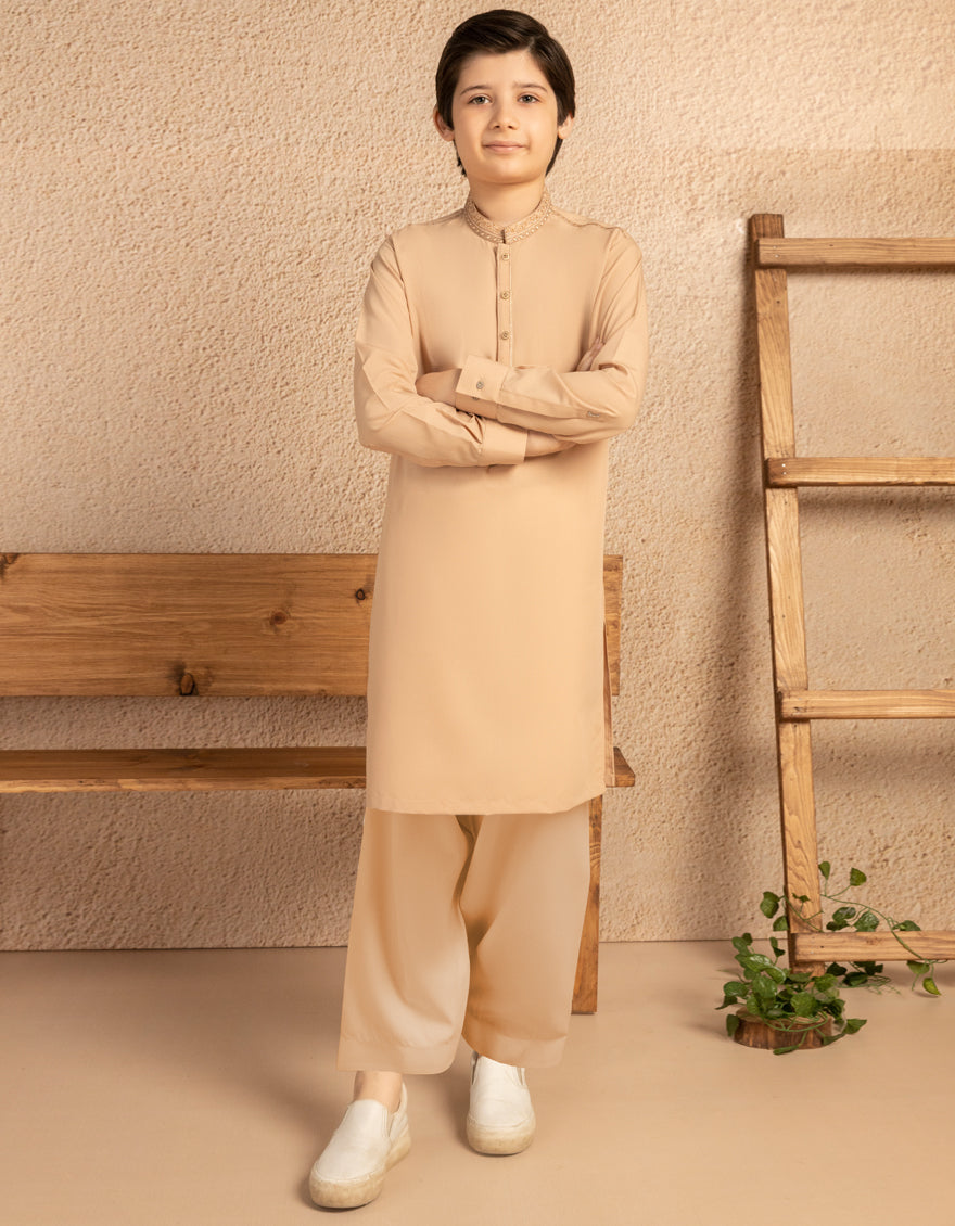 Made for the modern young man, this Kameez Shalwar is a perfect blend of style and comfort. Its simple yet elegant design makes it suitable for a range of occasions, ensuring that your little one looks his best.