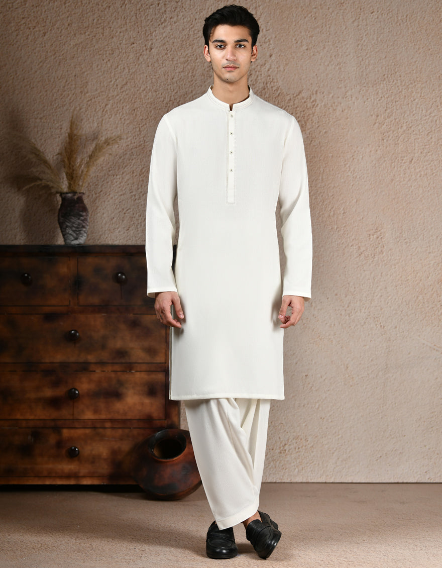 This men's Cream Blended Formal Kameez Shalwar epitomizes traditional charm and modern sophistication, featuring timeless designs, exquisite fabrics, and meticulous craftsmanship, perfect for adding a touch of cultural refinement to any occasion.