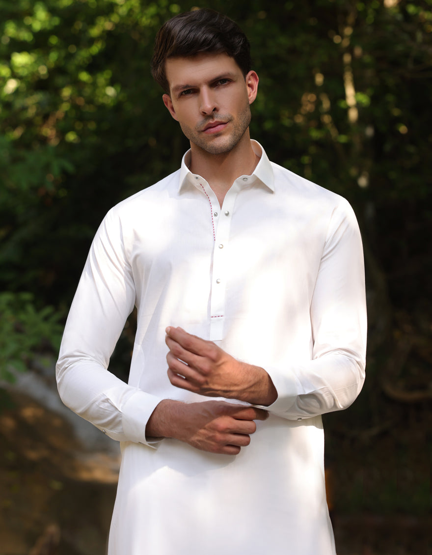 This basic men's White Blended Casual Kameez Shalwar epitomizes effortless sophistication and classic charm, making it a wardrobe staple for various cultural and casual events.