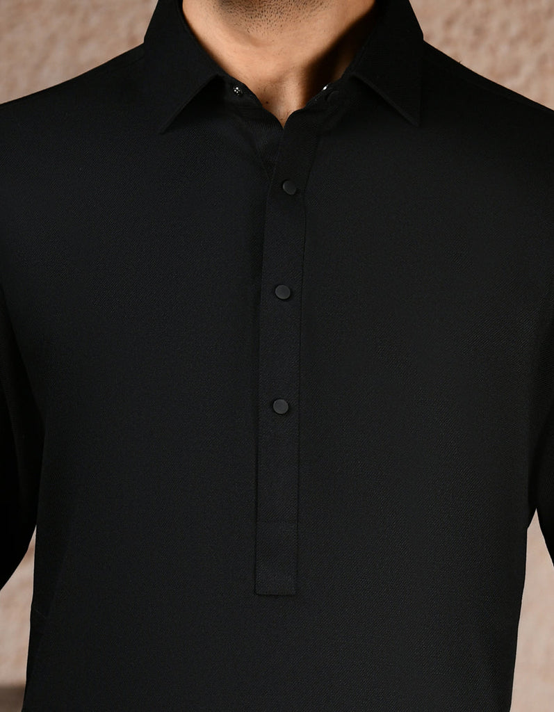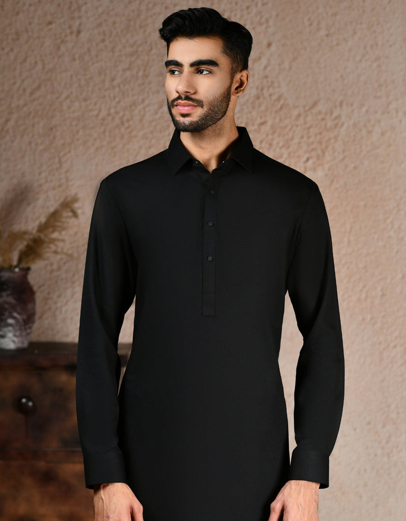 This basic men's Black Blended Casual Kameez Shalwar epitomizes effortless sophistication and classic charm, making it a wardrobe staple for various cultural and casual events.