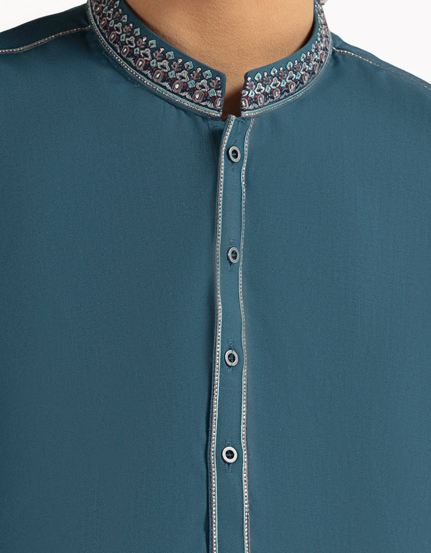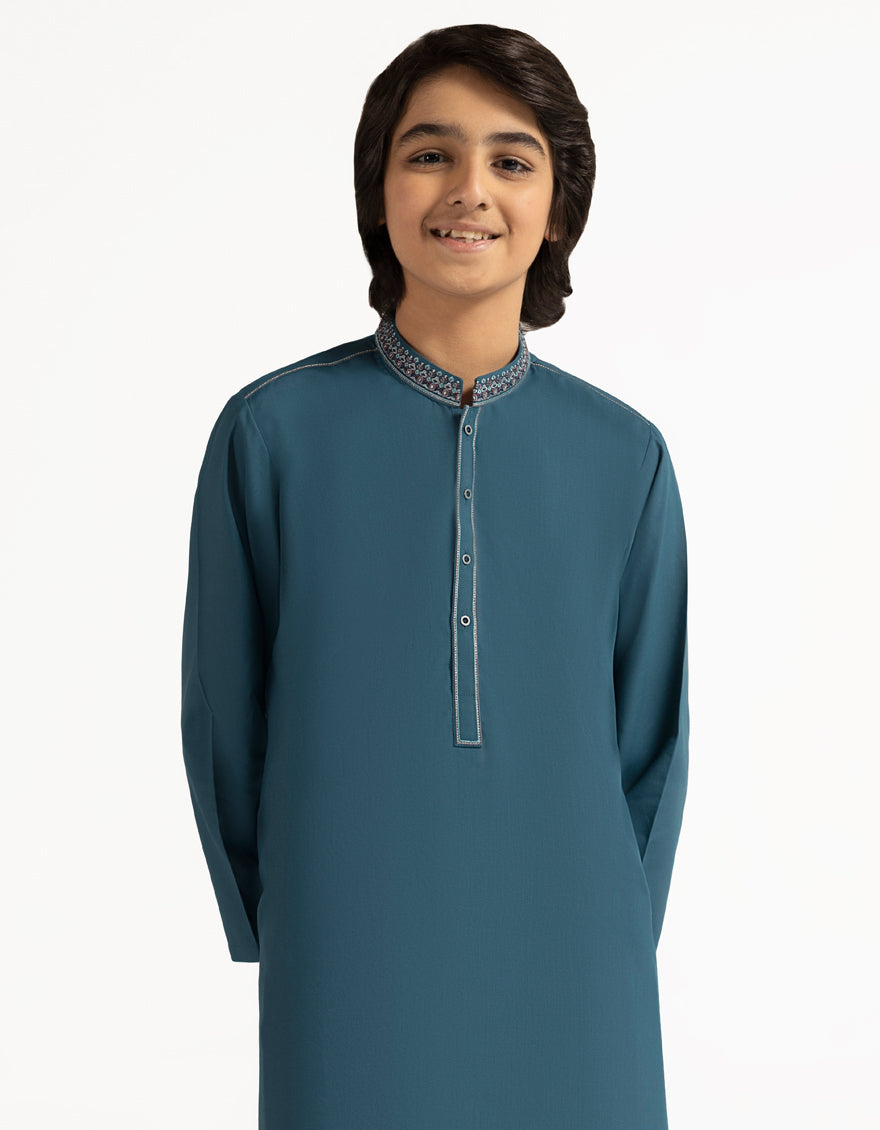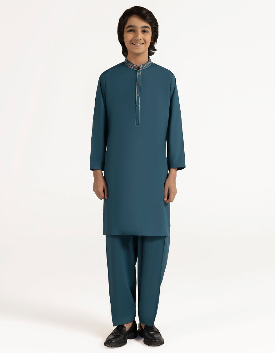 This semi-formal kurta shalwar combines comfort and style with elegant embroidery on the collar and front. Made from blended fabric, it is perfect for festive events and celebrations.