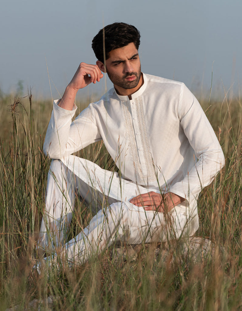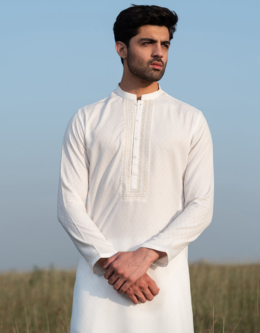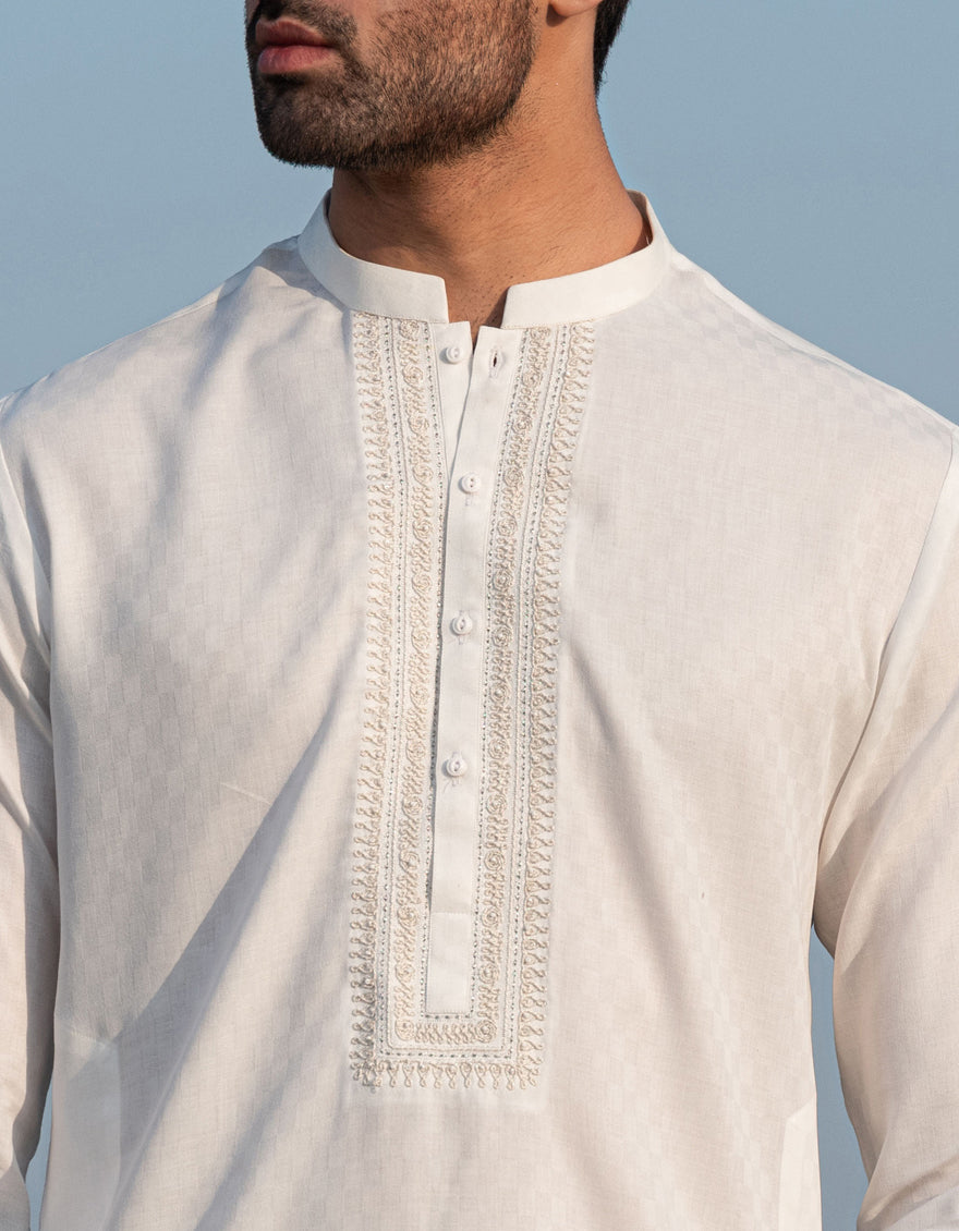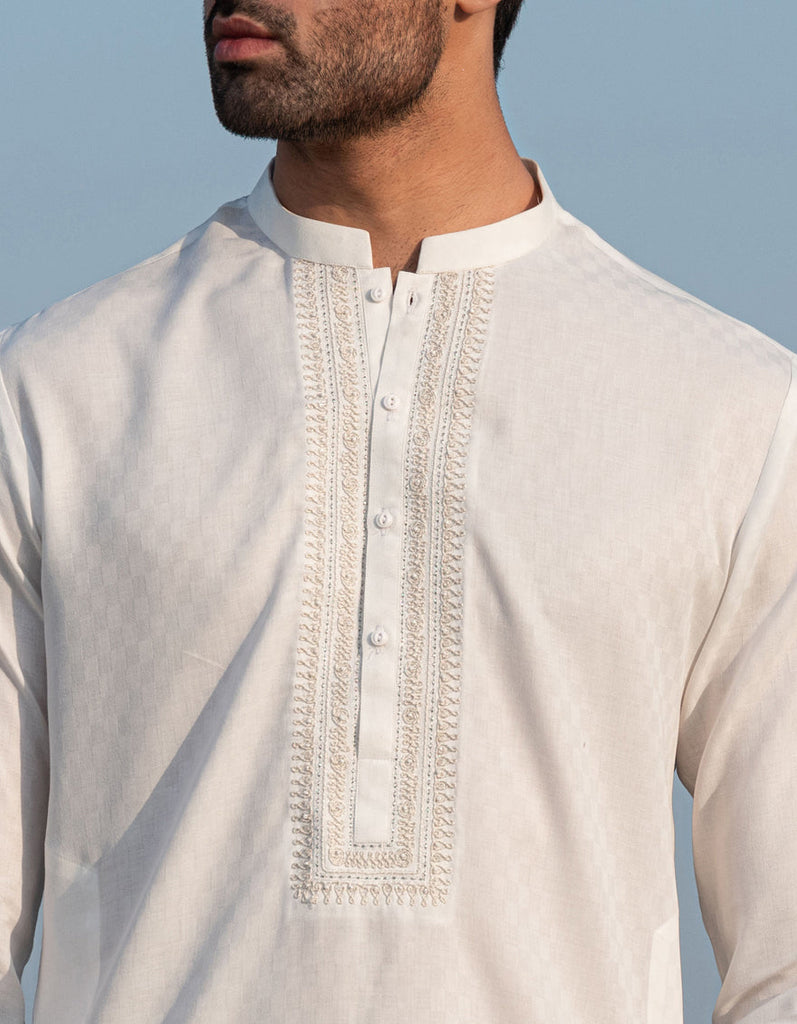 Stay comfortably stylish in this Off White Blended Formal Kurta, offering a classic design with a modern touch for a sophisticated look.