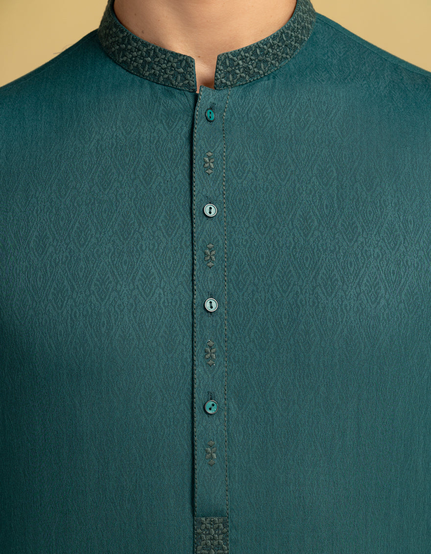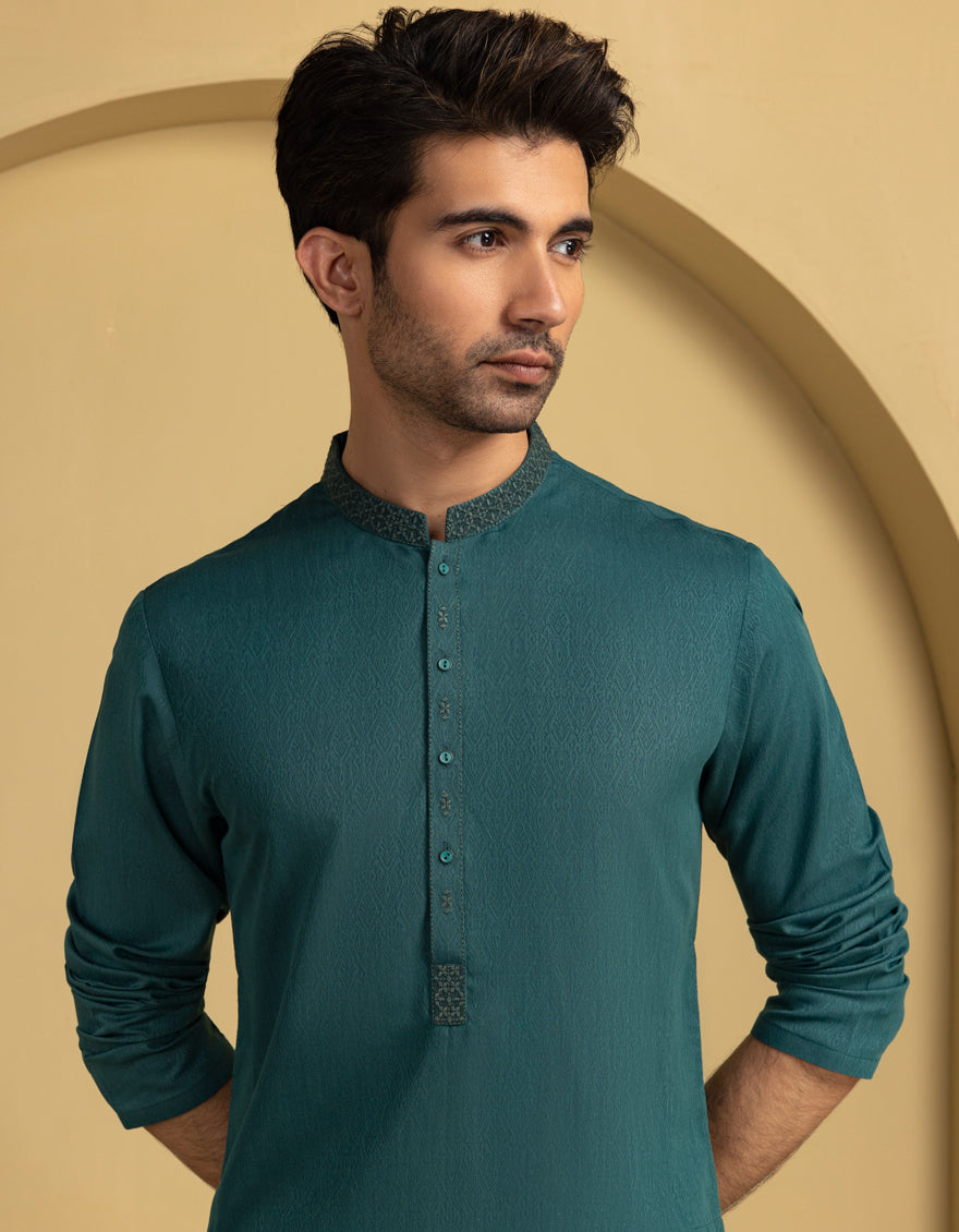 Upgrade your look with this Green Blended Semi-Formal Kurta, which mixes traditional and modern styles for a classy yet comfortable outfit.