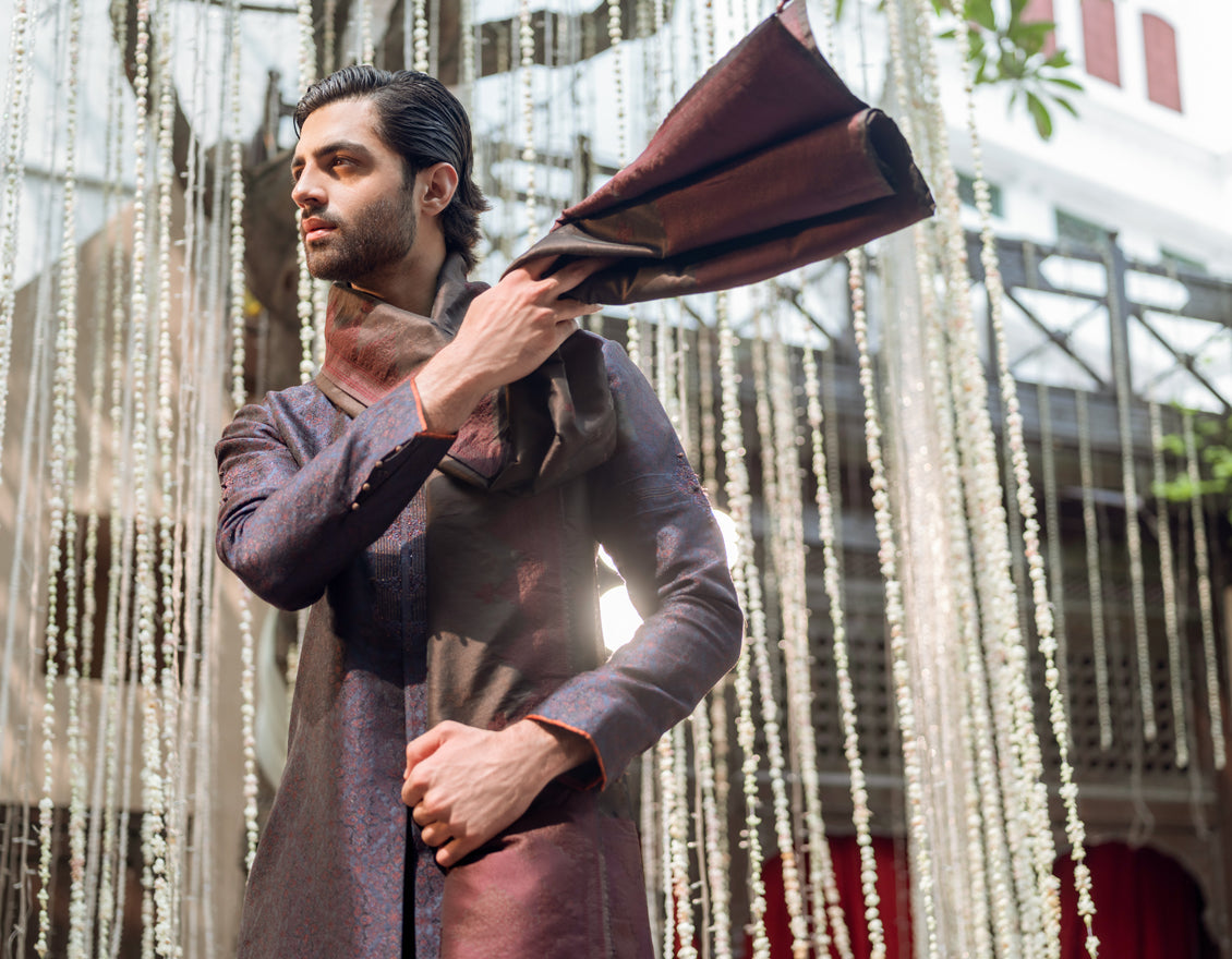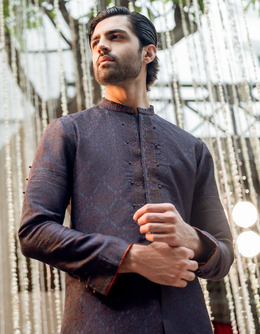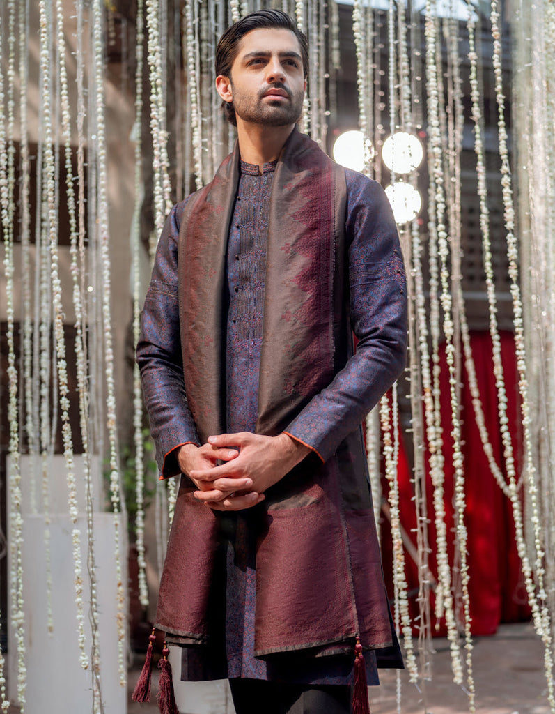 A regal kurta crafted from royal blue self-jamawar fabric in a front-open sherwani style. Combines the traditional kurta and sherwani cuts for a unique and sophisticated design.