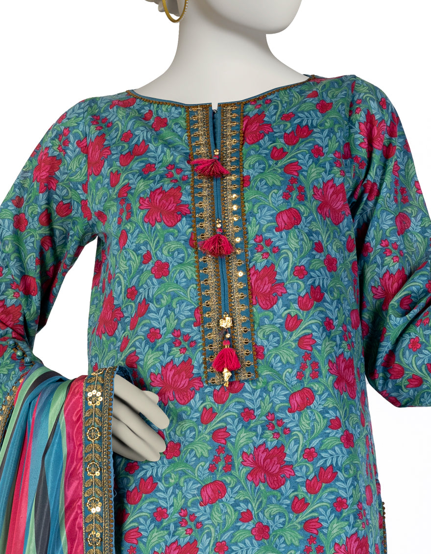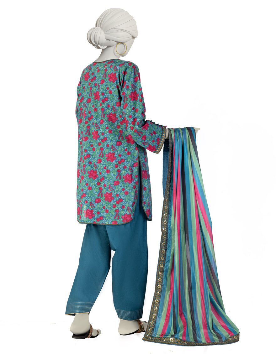 Collection: Embroidered Printed Lawn Shirt, Dyed Lawn Trouser, Digital Printed Silk Dupatta
