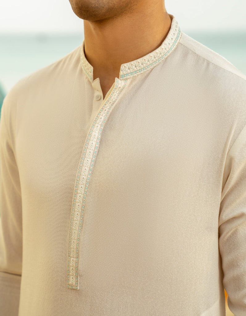 A perfect fusion of tradition and contemporary fashion, this Off White Blended Kameez Shalwar for teen boys exudes effortless style. Its classic appeal offers versatility, suitable for a wide range of events and environments.