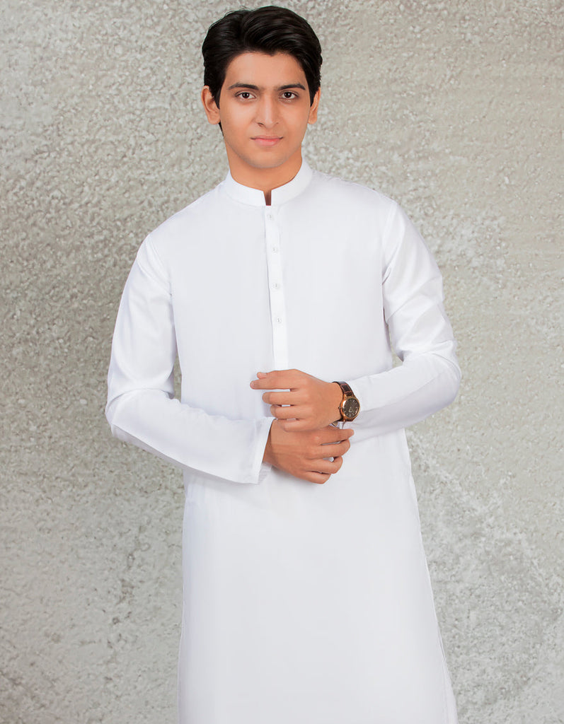 Explore our latest teen boys' white blended casual kameez shalwar, designed with a blend of classic simplicity and Eastern charm. This oufit offer a stylish yet understated look, suitable for a variety of occasions.