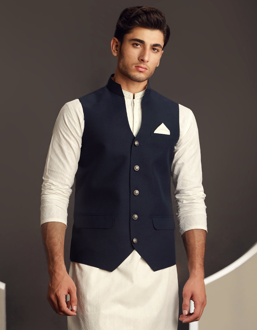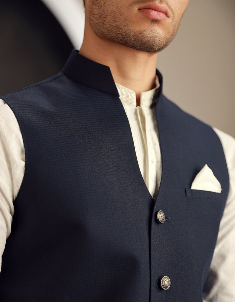 Enhance your traditional ensemble with this classic Navy blue blended waistcoat. Its timeless design makes it a versatile piece for any occasion.