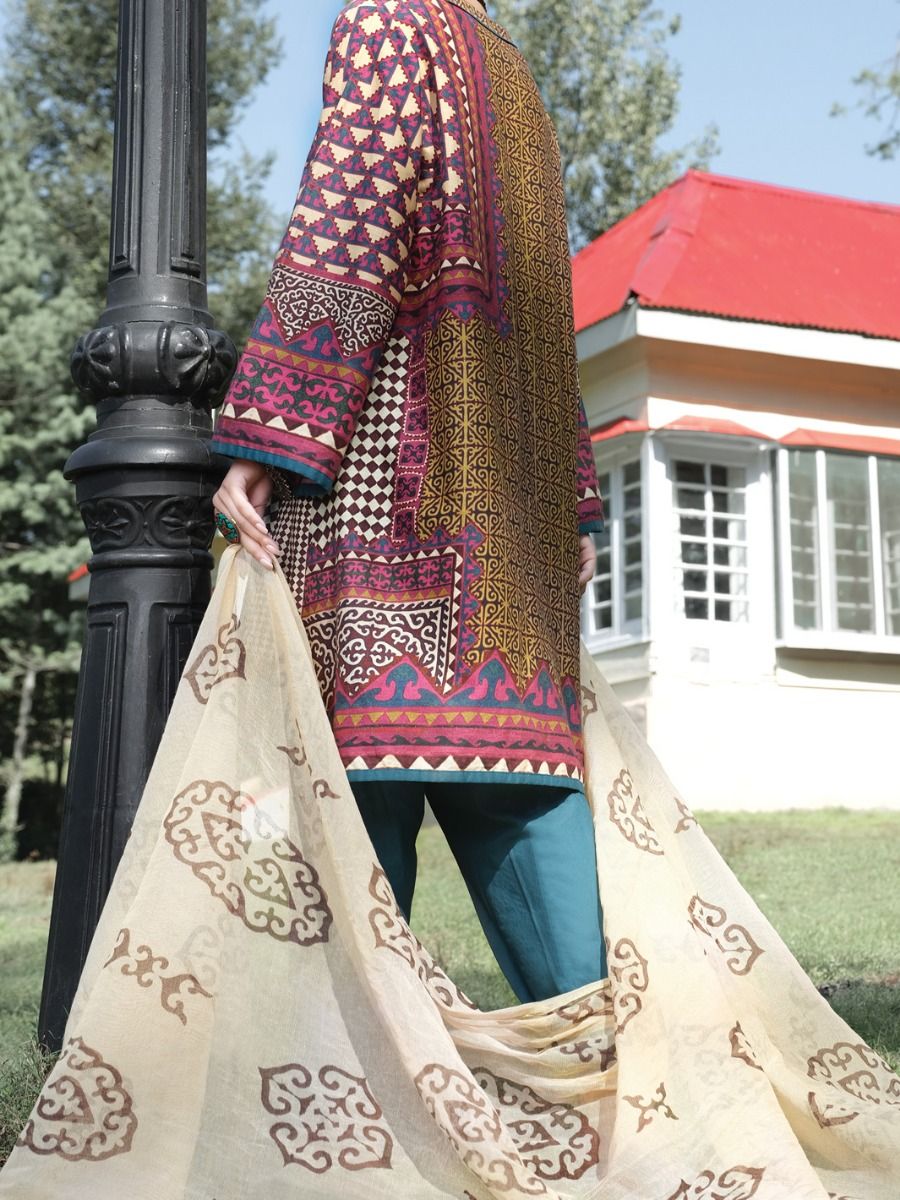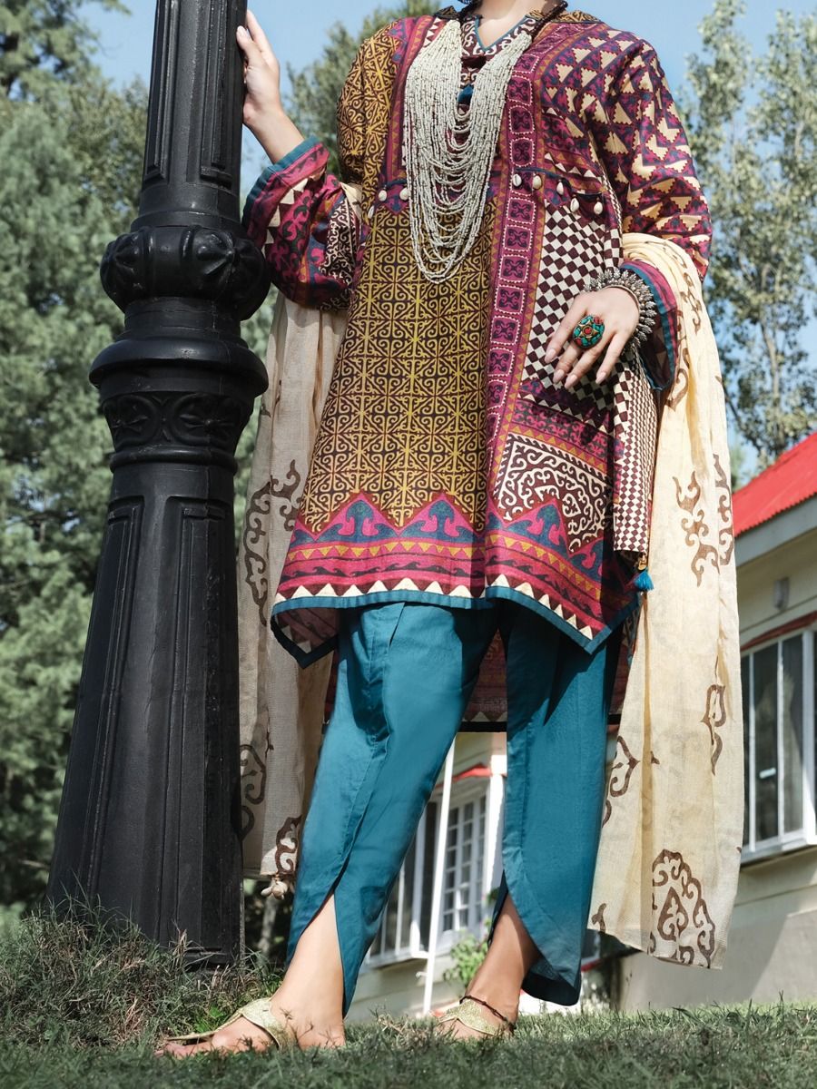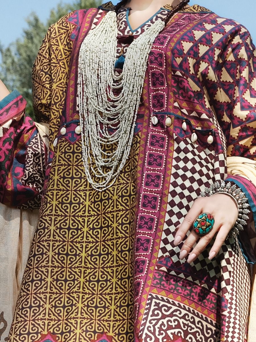 Frock Style Shirt With Enhanced With Tassels & Shells. Paired With Screen Printed Khaddi Net Dupatta & Tulip Pants.