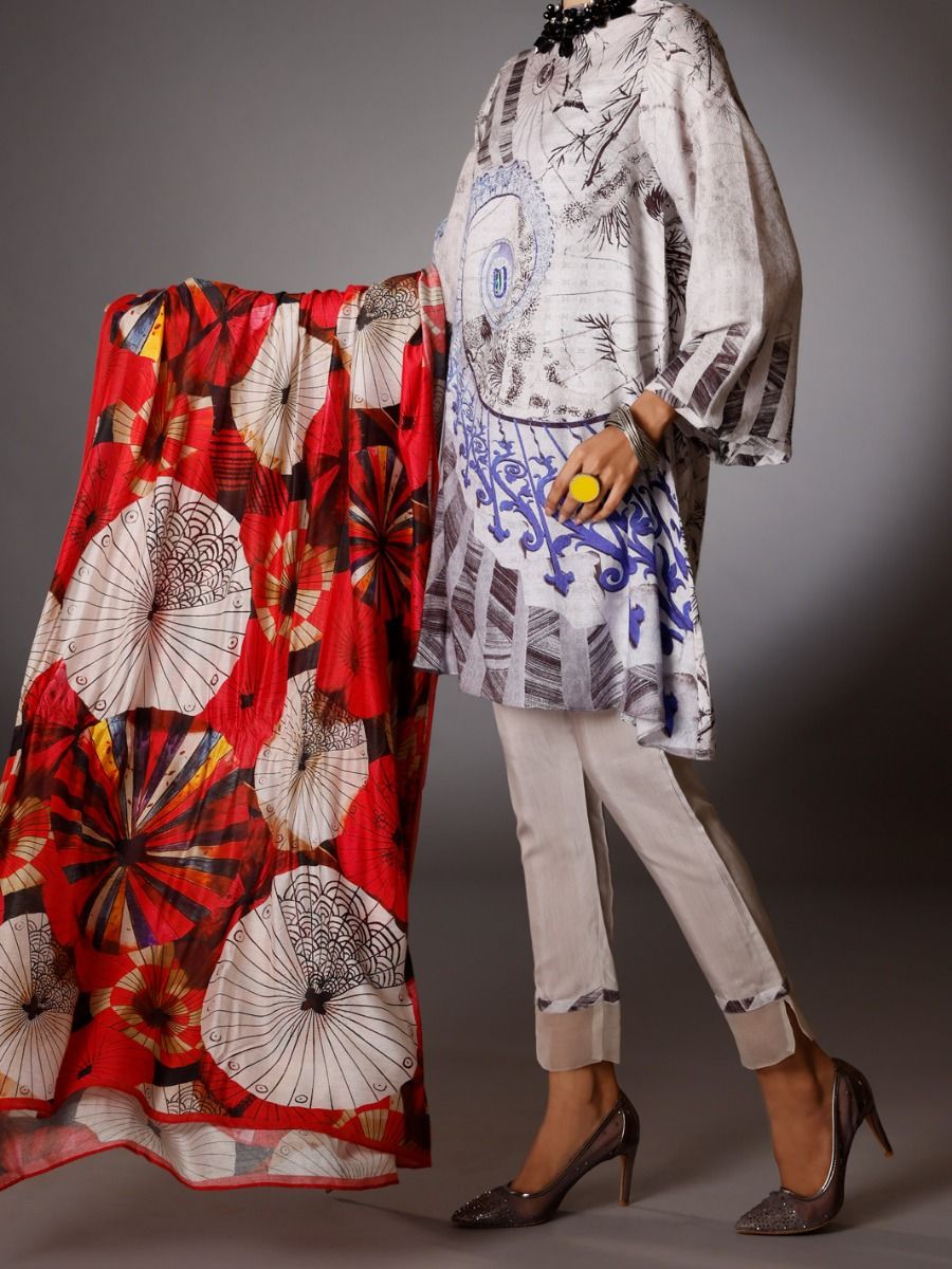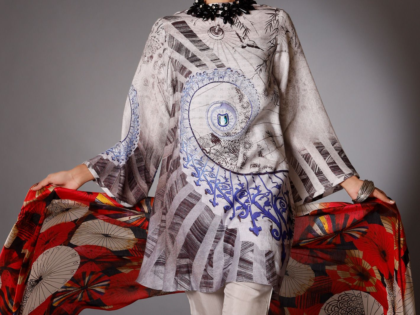 A-Line Shirt With Asymmetrical Hem Beautify With Brooch Detail. Paired With Viscose Net Printed Dupatta & Cigarette Pants.