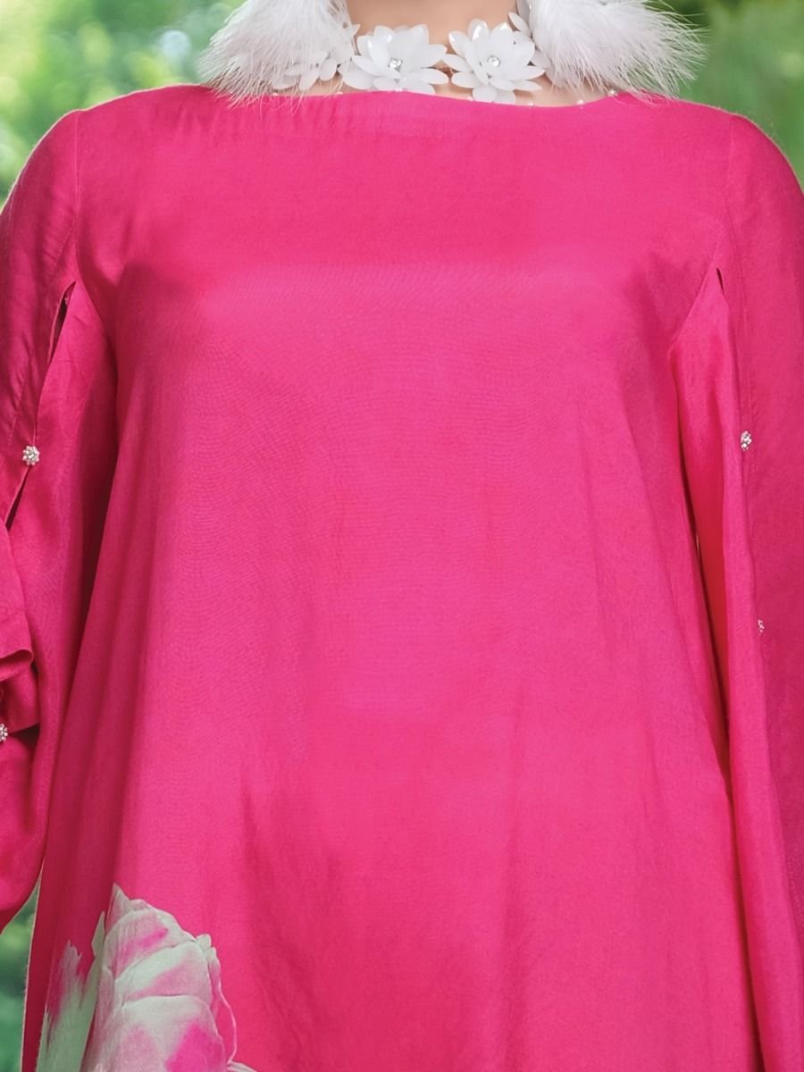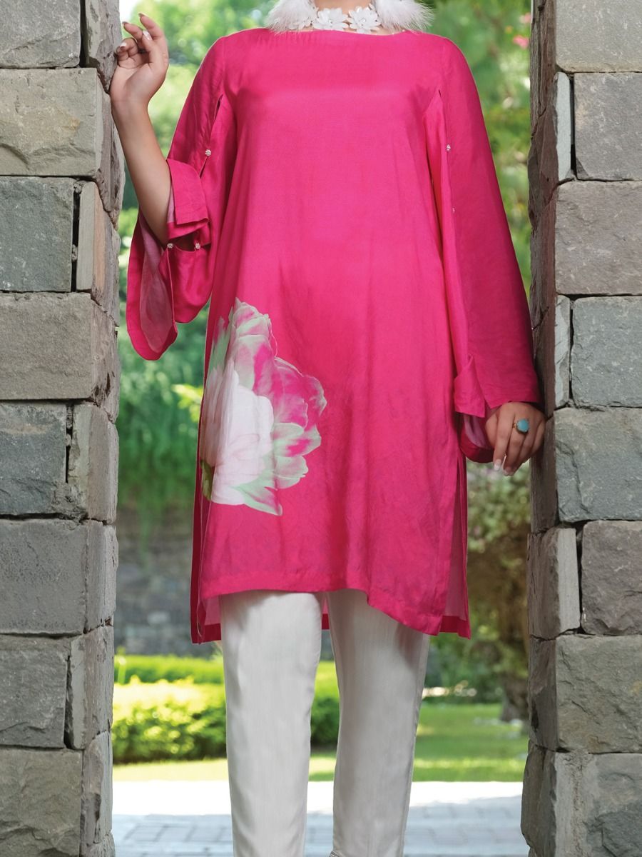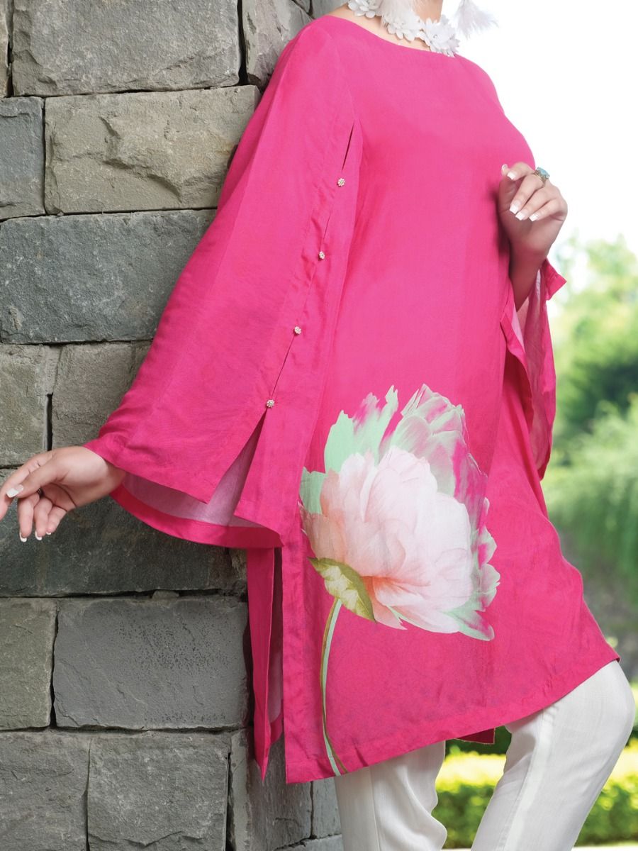 Striking Pink Digital Printed Loose Cut Silk Viscose Tunic Beautify With Slit Sleeves And Embellished Buttons On It.
