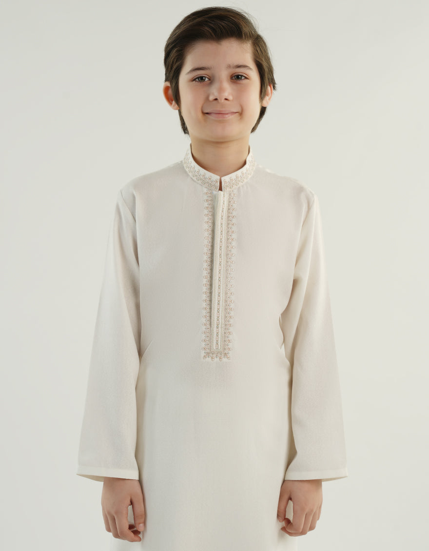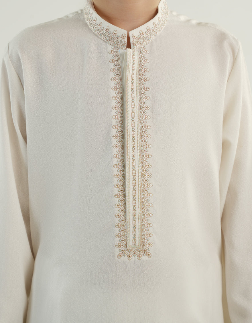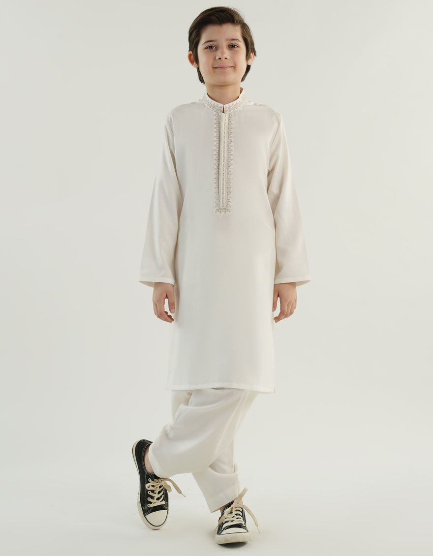 Made for the modern young man, this kameez shalwar is a perfect blend of style and comfort. Its simple yet elegant design makes it suitable for a range of occasions, ensuring that your little one looks his best.