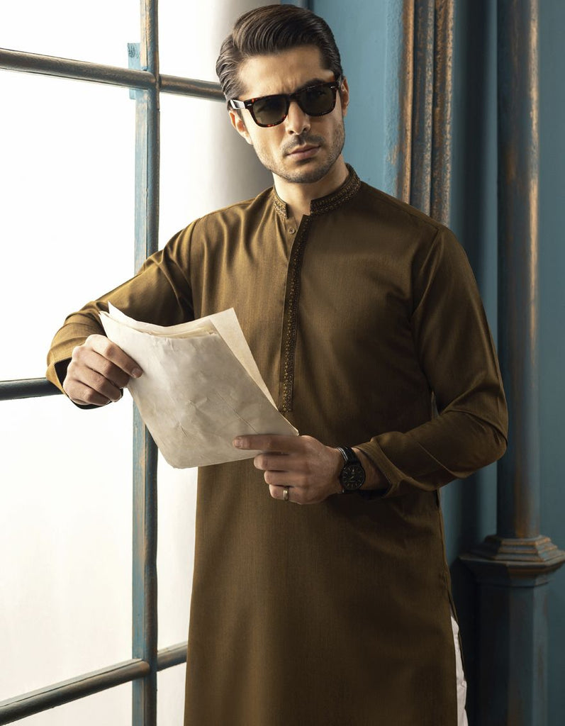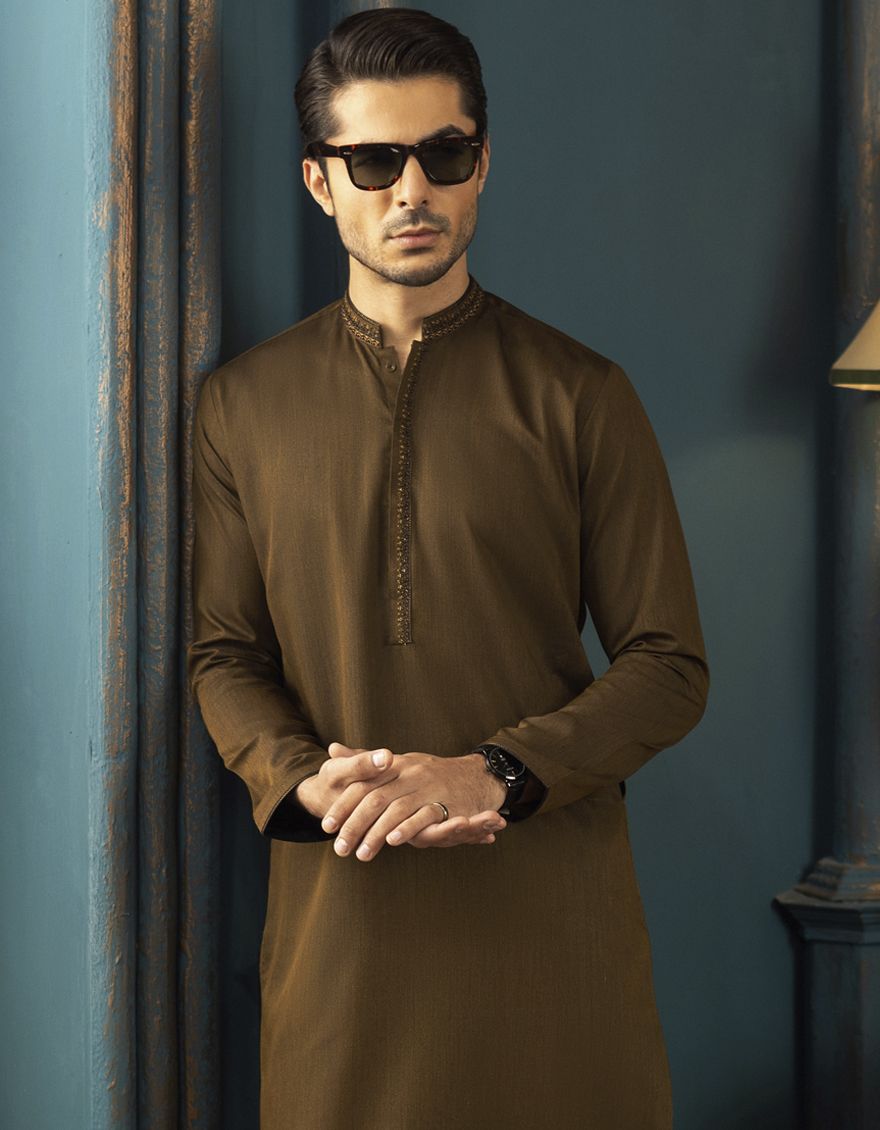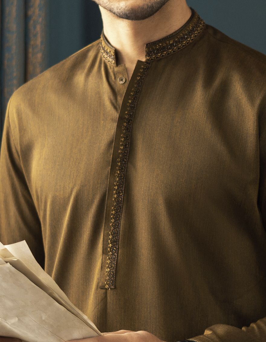 Formal Kurta For Men, With Computerized and Hand Touches Embroidery On Collar And Placket.
